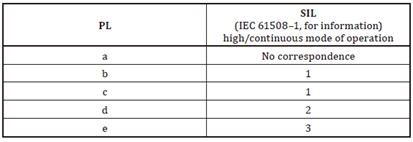 控制系統(tǒng)安全相關(guān)部件在預(yù)期條件下執(zhí)行安全功能的能力分為5級,稱之為性能等級(PL)。這些性能等級由每小時發(fā)生危險失效的概率來定義。